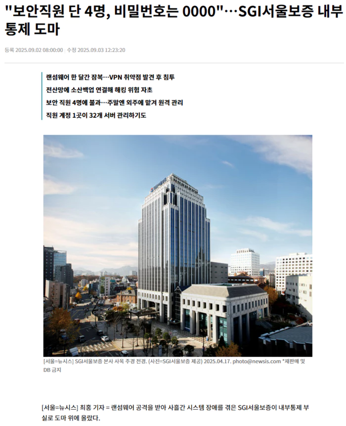 2일 뉴시스 취재를 종합하면 SGI서울보증에서 발생한 랜섬웨어 침해사고는 금융회사가 지켜야 할 기본적인 내부통제조차 제대로 작동하지 않았음을 보여준다.
