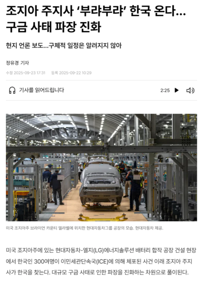 이에 대해 켐프 주지사실은 “주지사의 한국 방문은 (한국 노동자를 체포했던) 9월 4일 이전부터 협의 중이었다”며 “이번 방문은 조지아주의 경제,교육, 문화 파트너와의 유대를 강화하기 위한 것”이라고 밝혔다. 켐프 주지사의 방한은 이번이 세번째이며, 이민 단속 여파 속에서 현대차와의 만남 계획이 급하게 진행된 것으로 보인다고 이 매체는 보도했다. 한국인 대거 구금으로 인해 대미 여론이 악화한 데다, 현대자동차-엘지에너지솔루션 합작 건설 현장의 인력 재투입 문제가 걸려 있는 까닭이다.