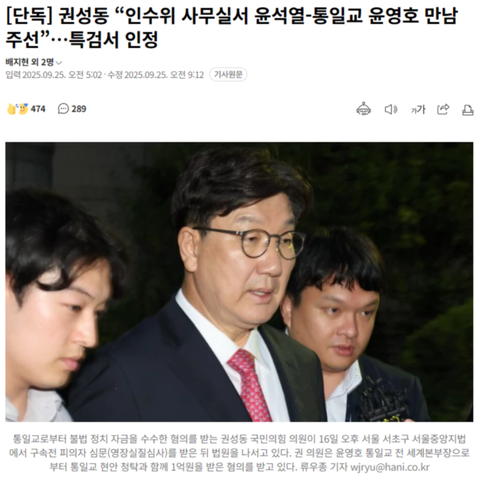 권 의원은 최근 통일교 로비 의혹을 수사하고 있는 민중기 특별검사팀의 조사에서 “2022년 3월22일 윤 전 본부장을 대통령직인수위원회(인수위) 사무실로 데리고 가 대통령 당선자 신분이었던 윤 전 대통령과 만나게 해줬다”는 취지로 진술했다.