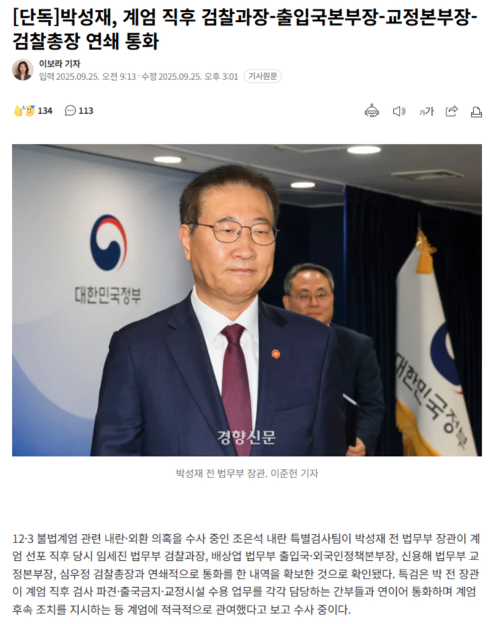 25일 경향신문 취재 결과 특검은 박 전 장관이 계엄 선포 직후인 지난해 12월3일 오후 11시쯤 용산 대통령실에서 국무회의를 마친 뒤 법무부 간부 회의를 위해 정부과천청사로 이동하던 중 법무부 간부, 심 전 총장과 연달아 통화한 내역을 확보해 살펴보고 있다.