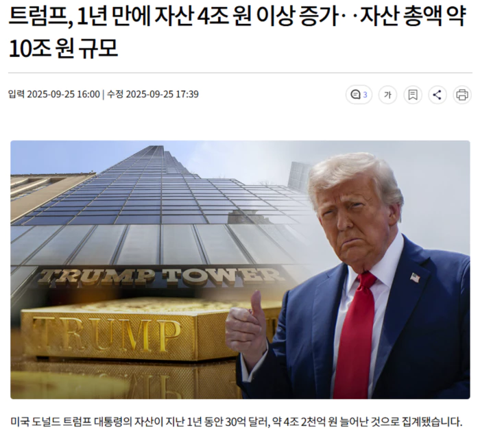미국 경제 매체 포브스는 현지시간 24일 트럼프 대통령의 자산 총액은 73억 달러, 우리 돈 약 10조 2,300억 원이며 이 가운데 4조 2천억 원은 최근 1년 사이에 증가했다고 보도했습니다.