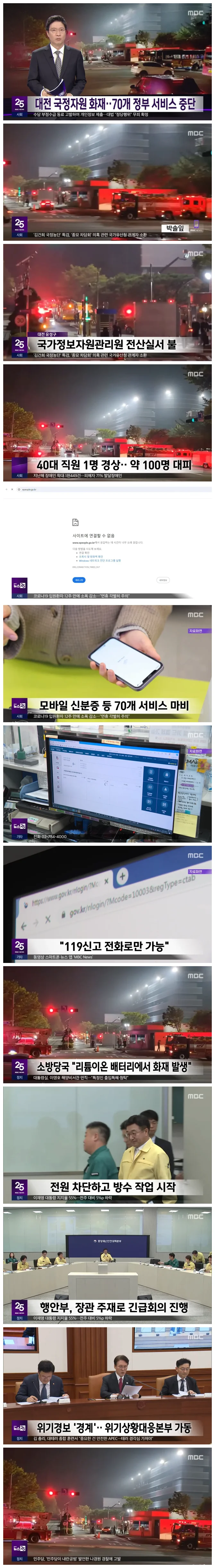 정부의 전산시스템을 관리하는 대전의 '국가정보자원 관리원'에서 화재가 발생해, 정부 전산서비스가 대규모로 마비됐습니다.