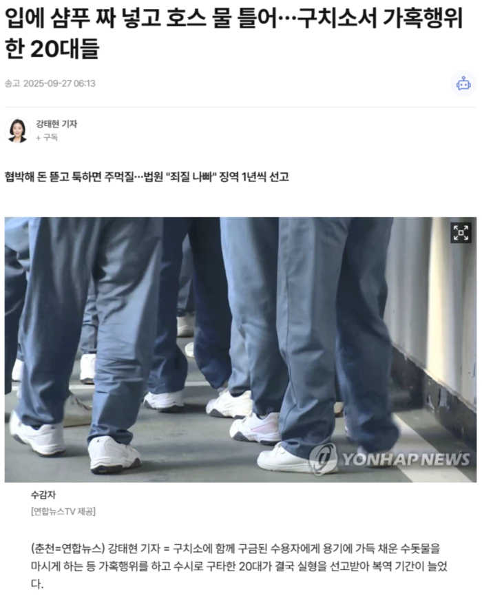 춘천지법 형사2부(김성래 부장판사)는 특정범죄가중법상 보복 협박, 공갈, 폭력행위처벌법상 공동강요·공동폭행, 폭행 혐의로 기소된 A(22)씨에게 징역 1년을 선고했다고 27일 밝혔다. 또 폭력행위처벌법상 공동강요·공동폭행, 폭행 혐의로 함께 재판에 넘겨진 B(21)씨에게도 징역 1년을 선고했다. 두 사람은 2023년 10∼11월 서울구치소에 함께 수용돼 있던 C(23)씨에게 가혹행위를 한 혐의로 재판에 넘겨졌다. 공소장에 따르면 A씨와 B씨는 약 5.5리터(L) 용량의 용기에 수돗물을 가득 채운 뒤 C씨에게 '3분 안에 다 마시지 못하면 다시 물을 채워 마시게 하겠다고 말하고, 물을 마시다 구토하는 C씨를 주먹과 발로 여러 차례 때렸다. 이후 용기에 다시 수돗물을 채워 C씨가 모두 마시게 하고, C씨가 '화장실에 가고 싶다'고 하자 이들은 '화장실 가고 싶은 만큼 몸으로 표현해봐'라고 말하며 춤을 추는 C씨의 온몸을 여러 차례 폭행했다. 이어 C씨에게 상의를 벗고 바닥에 눕게 시킨 뒤 손으로 C씨의 배를 누르며 '1분 동안 오줌을 끊지 않고 싸라'고 했으나 C씨가 지시대로 하지 못하자 용기에 재차 물을 가득 채워 C씨에게 모두 마시게 하고 주먹으로 배를 때렸다. A씨는 '내가 너의 형사재판 합의를 도와주기 위해 쓴 시간, 노력, 비용, 정신적 스트레스 비용이 150만원 정도 되니 150만원을 보내라. 신고하면 네 사건 피해자에게 편지를 보내겠다'며 C씨 부친을 통해 자기 모친 계좌로 150만원을 송금하게 한 혐의도 더해졌다. A씨는 C씨 입 안에 클렌징폼, 샴푸, 린스를 짜 호스를 C씨 입 안에 넣고는 수도를 틀어 이를 마시게 하고, 이를 신고하면 C씨 가족들의 신변에 위협을 주겠다고 협박하기도 했다. B씨 역시 구치소 내에서 빗자루질하는 C씨의 발뒤꿈치를 걷어차 넘어뜨려 주먹질하고, 손으로 눈꺼풀을 잡아 올린 뒤 눈동자 부위에 딱밤을 때리는 등 여러 차례에 걸쳐 그를 폭행한 사실이 공소장에 담겼다. .. 후략 ..