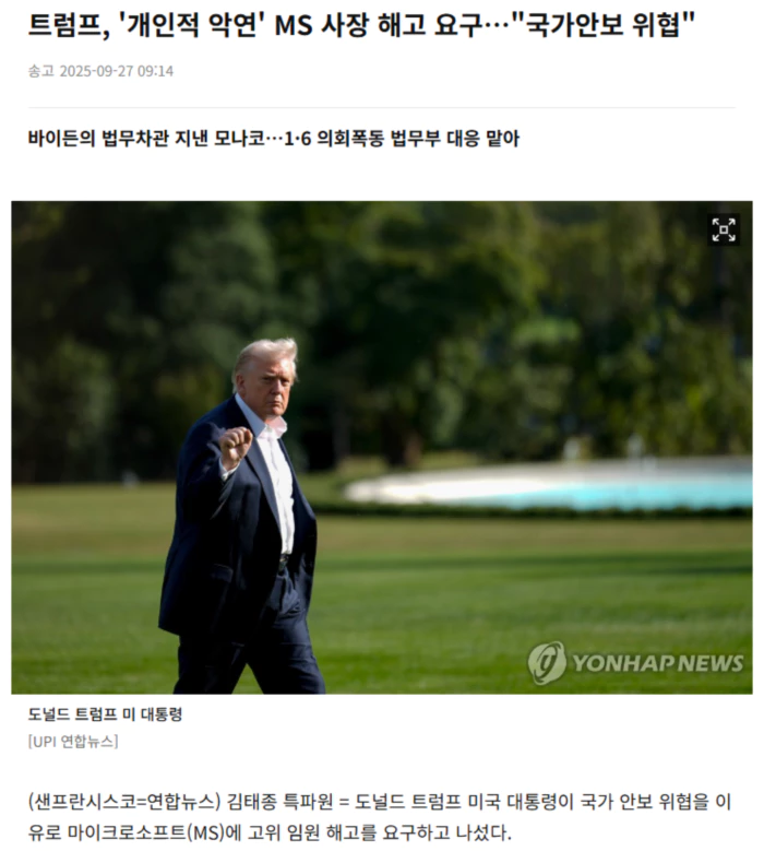 트럼프 대통령은 26일(현지시간) 자신의 소셜미디어(SNS) 트루스소셜에 MS가 글로벌 업무 담당 사장인 리사 모나코를 해고해야 한다고 밝혔다. 트럼프 대통령은 "그녀가 MS에서 맡은 직책으로 인해 매우 민감한 정보에 접근할 수 있다"며 "그런 접근 권한을 갖는 것은 용납될 수 없고 절대 허용돼서는 안된다"고 주장했다. 이어 "미국 정부와 MS가 맺은 계약을 고려할 때 그녀는 국가안보에 위협이 된다"며 "내 생각에 MS는 즉시 리사 모나코의 고용을 종료해야 한다"고 적었다. 또 "모나코의 수많은 불법적 행위 때문에 미국 정부는 최근 그녀의 모든 보안 인가를 박탈하고, 국가 안보 정보 접근을 차단했으며, 모든 연방 소유지 출입을 금지했다"고 말했다. 트럼프 대통령은 구체적인 국가안보의 위협에 대해서는 언급하지 않았다. MS에 사장 해임을 요구한 것은 리사 모나코와 트럼프 대통령의 개인적 악연에서 비롯됐을 수 있다는 분석이 나온다. 리사 모나코는 버락 오바마 행정부 당시 국토안보·대테러 담당 보좌관으로 일했고, 조 바이든 행정부 시절 법무부 차관을 지냈다. 특히, 트럼프 대통령 지지자들이 2020년 대선에 불복하며 의사당에 난입한 '1·6 의회폭동'에 대한 법무부 대응을 주도했다. 그녀는 지난 7월 MS에 합류해 각국 정부와의 정책 협력 및 규제에 대응을 총괄하는 업무를 맡아왔다. 트럼프 대통령은 의회에서 허위 진술과 의회 절차 방해 혐의로 전날 기소된 제임스 코미 전 연방수사국(FBI) 국장에 대해서도 "더러운 경찰(Dirty Cop)"이라고 이날 맹비난했다. 코미 전 국장은 2016년 미 대선 당시 트럼프를 당선시킬 목적으로 러시아가 개입했다는 의혹을 수사했다가 트럼프와 오랜 갈등을 빚어 왔다. .. 후략 ..