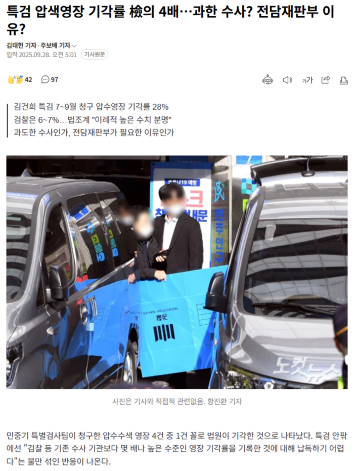 CBS노컷뉴스가 입수한 '수사기간 연장 결정 및 사유보고서'에 따르면, 지난 7월 2일부터 9월 23일까지 김건희 특검팀이 법원에 청구한 압수수색 영장은 총 250건이다. 이 중 법원은 179건을 발부했고 71건을 기각했다. 해당 보고서는 특검이 오는 29일로 만료됐던 수사기간을 다음달 29일까지로 연장하면서 관련 내용을 지난 23일 대통령실과 국회에 보고한 문서다. 28%라는 특검의 압수수색 영장 기각률은 통상 6~7% 수준인 검찰의 기각률의 약 4배에 이르는 수치다. 특검 내부에서 법원의 영장 발부 기준이 기존 수사기관과 달리 적용되는 것 아니냐는 뒷말까지 나오는 이유다. 심지어 특검 출범 초기에는 법원에 보낸 압수수색 영장이 사흘 만에 발부되거나, 일부 기각으로 판단할 만한 건에 대해서도 전부 기각으로 돌려보낸 경우가 적지 않았다는 후문이다. 수사의 신속성이나 기밀성 등을 유지가 생명인 압수수색 특성상 법원 심사 단계에서만 며칠이 걸리거나 건건이 제동이 걸린다면 수사 차질은 불가피하다. 특검이 청구한 일부 구속영장의 경우 구속 전 피의자 심문(영장실질심사)이 닷새씩 걸린 경우도 있었다. 한 부장검사 출신 변호사는 "법원이 수사기록을 며칠 동안 갖고 있으면서 심문기일까지 진행할 경우 기록을 보낸 수사팀 입장에서는 그야말로 애가 타는 심정일 것"이라고 말했다. 일각에서는 특검이 범죄 소명이 부족하거나 광범위한 압수수색 영장을 청구해서라는 시각도 있다. 한 검찰 출신 변호사는 "압수수색 영장이 전부 기각되는 경우는 아주 드물다. 통상 검찰에서 통 기각을 당하면 위에서 상당한 꾸중을 듣는 정도"라고 했다. 다른 한편에선 이런 영장 기각 현상과 여당인 더불어민주당 주도로 '특검 전담재판부' 도입이 추진되는 것이 맞물린다는 분석도 있다. 현 사법부에게 내란 및 국정농단에 대한 공정한 재판과 영장 발부를 기대하기 어렵다는 여론의 의심이 적지 않다는 것이다. .. 후략 ..