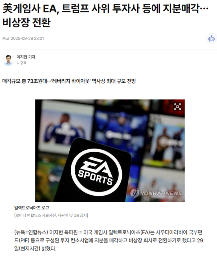 인수 컨소시엄은 EA 지분을 이미 10% 보유한 사우디 국부펀드 외에 실버레이크, 어피니티 파트너스로 구성됐다.
