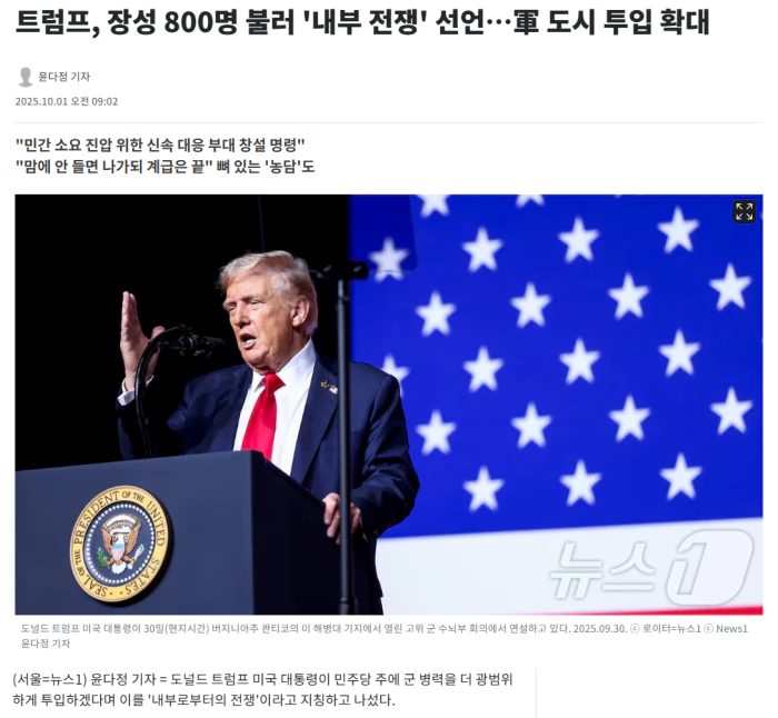 30일(현지시간) 파이낸셜타임스(FT)에 따르면 트럼프 대통령은 이날 버지니아주 콴티코 해병대 기지 연설에서 "급진 좌파 민주당이 운영하는 샌프란시스코, 시카고, 뉴욕, 로스앤젤레스 등 도시는 매우 안전하지 않다"며 이같이 밝혔다. 트럼프 대통령은 전 세계에서 소집된 군 수뇌부 800여명 앞에서 "우리는 하나하나 바로잡을 것이다. 여기 있는 사람 일부에게 주요 과제가 될 것"이라며 "이것 또한 전쟁, 내부로부터의 전쟁이다"라고 강조했다. 또한 "우리 역사는 외부의 적과 내부의 적, 모든 적에 맞서 싸운 군 영웅들로 가득하다"며 "많은 지도자가 평화를 유지하기 위해 군을 활용했는데, 이제 와서 군을 쓰면 안 된다고들 한다"고도 말했다. 여기에 "일부 위험한 도시와 훈련장을 군대가 활용해야 한다"며 "민간 소요를 진압하기 위한 군의 '신속 대응 부대'(quick reaction forces) 창설을 명령했다"고 밝혔다. 그러면서 "우리는 내부로부터 침공당하고 있다. 제복을 입지 않는다는 점에서 오히려 외부의 적보다 더 어려운 위협"이라고 덧붙였다. 해당 법은 민주주의를 보호하기 위해 연방군이 내부 치안 유지나 법 집행에 사용되는 것을 엄격하게 금지하는 '포세 코미타투스 법' 위반 소지가 있다. CNN은 연설 시작에 앞서 트럼프 대통령이 "손뼉 치고 싶으면 치라. 내 말이 마음에 안 든다면 방을 나가라. 물론 그 순간 당신의 계급도, 미래도 끝이다"라고 말했던 지점에 주목하며 "군 장성들이 정치적 압력에 직면해 있다"고 분석했다. 당시 군 장성들은 정치 지도자들에게 박수를 보내지 않는 전통에 따라 침묵을 지키고 있었다. 트럼프 2기 행정부는 정치적 문제 해결에 군 병력을 빈번하게 동원하고 '군의 정치화'를 시도하는 언행을 보여 왔는데, 이번 연설은 그 정점에 섰다는 우려가 제기된다. .. 후략 ..
