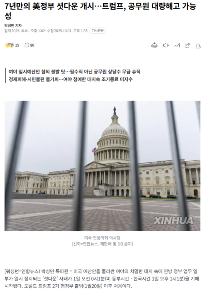 연방 정부의 2025회계연도 최종일인 전날(9월 30일) 자정까지 의회에서 2026회계연도 예산안 또는 단기 지출 법안(임시예산안·CR)이 처리되지 않아 정부를 운영할 새로운 지출에 대한 법적 권한이 사라지면서 미국은 셧다운 사태를 맞게 됐다. 상원은 셧다운을 피하기 위해 지난달 30일 7주짜리 공화당의 임시예산안(CR)을 표결(가결 정족수 60표)에 부쳤으나 찬성 55 대 반대 45로 부결됐고, 민주당이 자체 발의한 임시예산안도 마찬가지로 표결에서 부결됐다. 미국에서 셧다운 사태는 트럼프 집권 1기 때인 2018년 12월(개시 시점 기준) 이후 약 7년 만이다. 셧다운은 재정 지출에 대한 의회의 통제를 규정한 '적자 재정 방지법'에 따른 것이다. 의회의 승인이 없으면 일부 예외를 뺀 대부분 기관에 예산을 지급할 수 없기 때문에 연방 정부 공무원중 국가 안보, 공공 안전, 헌법상 기능 등과 관련된 필수 인력을 제외한 상당수가 무급 휴직에 들어가게 됐다. 무급휴직 공무원들이 급여를 받지 못하면서 생기는 경제적 피해뿐 아니라 연방 정부가 제공하는 공공 서비스도 일부 중단되기 때문에 시민들의 불편도 작지 않을 전망이다. 이번 사태는 미국 여야가 CR을 통과시키는 데 실패한 데다 이후 협상이 교착 속에 합의점을 찾지 못하면서 발생했다. 여당인 공화당은 지난달 19일 하원에서 기존 지출 수준을 그대로 유지하는 '클린'(clean) CR을 통과시켰지만, 같은 날 상원에서 민주당의 반대로 법안 최종 통과는 무산됐다. 민주당은 올해 말로 종료되는 공공의료보험 '오바마 케어'(ACA·Affordable Care Act) 보조금 지급 연장 등을 요구하며 공화당이 주도하는 CR에 반대하고 있다. 트럼프 대통령과 여야 의회 지도부가 셧다운 발생을 이틀 앞둔 지난달 29일 백악관에서 회동했지만, 합의점에 이르지 못했다. .. 후략 ..