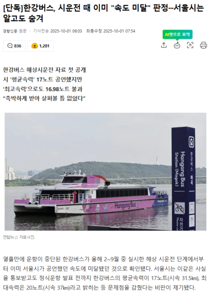 30일 국회 농림축산식품해양수산위원회 소속 이병진 더불어민주당 의원은 한국해양교통안전공단(KOMSA)으로부터 ‘한강버스 해상시운전 성적서’를 제출받아 공개했다. 한강버스는 서울시에 정식 인도되기 전인 올 2월과 8월, 9월 중 해상에서 시운전을 하며 성능 및 안전테스트 등을 거쳤다. 성적서를 보면 시운전에 나선 한강버스 8척(1~4호, 9~12호)의 평균 최고속도는 15.8노트(시속 29km)였다. 가장 빠른 선박(10호선)의 최고속도은 16.98노트로, 시가 한강버스 계획 단계에서 밝힌 평균속도(17노트)에도 못 미친다. 성적서에 기재된 한강버스 선박별 ‘최고 속도’를 보면 1호는 15노트, 2호는 14.69노트, 3호는 14.88노트, 4호는 14.75노트였다. 9호는 16.90노트, 10호는 16.98노트, 11호는 16.82노트, 12호는 16.44노트였다. 해당 시운전 결과는 올해 2월부터 9월까지 차례대로 시에 공유됐다. 그럼에도 시는 정식운항 직전인 지난 14일까지 마곡에서 잠실까지 소요시간을 급행노선은 54분(편도)으로, 일반노선(편도)은 75분으로 홍보했다. 이는 평균속도를 17노트(최대속도 20노트)로 산정한 시간이다. 지난 15일 열린 정식운항 공식브리핑 당일이 되자 시는 말을 바꿨다. 평균속도를 12노트(시속 23㎞)로 산정해 급행노선 소요시간을 28분이 늘어난 82분으로, 일반노선 소요시간을 52분 늘어난 127분으로 발표했다. 시 관계자는 “한강 수심이 바다보다 낮아 배가 속력을 내는 데 한계가 있고 한강버스가 처음 도입되는 만큼 안전 등을 고려해 시간을 정했다”고 설명했다. 해상 시운전 과정에서 선박의 속도가 시의 애초 목표보다 저하된 이유 등에 대해선 아무런 설명이 없었다. .. 후략 ..