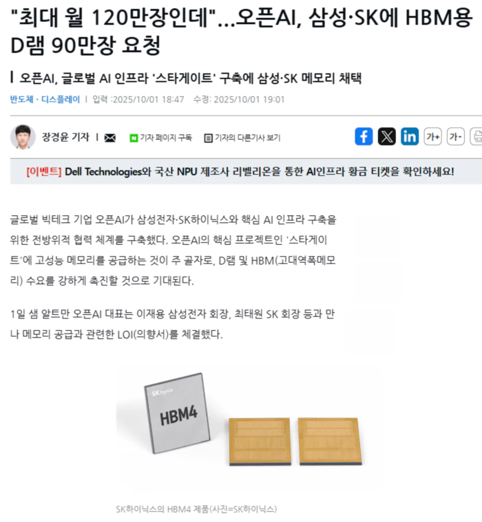 - 삼성·SK에 손 내민 오픈AI…K-메모리 성장동력 '기대감' 오픈AI는 미국 클라우드 기업 오라클, 일본 투자 회사 소프트뱅크와 함께 초거대 데이터센터를 건설하는 스타게이트 프로젝트를 추진하고 있다. 오는 2029년까지 약 5천억 달러(한화 약 700조원)의 거금이 투입될 예정이다. 데이터센터 구축에는 방대한 양의 데이터 처리를 위한 고성능·고효율 메모리가 필수적으로 탑재된다. 기업용 낸드인 eSSD는 물론, 서버용 D램과 HBM(고대역폭메모리) 등 제품 전반이 필요하다. 특히 HBM의 경우, 기존 D램 대비 메모리를 전송하는 통로인 대역폭이 높아 고부가 제품으로 각광받고 있다. 이에 따라 삼성전자, SK하이닉스 등 국내 주요 메모리 기업들은 중장기적 매출 성장을 위한 추가 동력을 확보하게 됐다. 삼성전자는 "회사는 스타게이트 프로젝트를 진행하고 있는 오픈AI가 고성능·저전력 메모리를 원활하게 공급받을 수 있도록 지원할 계획"이라며 "오픈AI가 메모리 솔루션 수급에 어려움을 겪지 않도록 지원할 방침"이라고 밝혔다. SK하이닉스는 "스타게이트 프로젝트에서 HBM 반도체 공급 파트너로 참여한다"며 "이번 메모리 공급 의향서 체결은 올해 상반기 기준 D램 글로벌 매출 1위인 SK하이닉스의 AI 전용 메모리반도체 기술력과 공급 역량을 인정받은 결과"라고 설명했다. - D램 최대 월 90만장 요구…삼성·SK 총 생산능력 120만에 필적 업계의 이목을 끈 또 하나의 대목은 오픈AI가 요구한 D램 물량이다. 샘 알트만 오픈AI 대표는 양사와의 만남에서 월 90만장에 이르는 D램 공급량을 요구한 것으로 알려졌다. 삼성·SK 역시 각사 보도자료에 해당 물량을 명시했다. .. 후략 ..