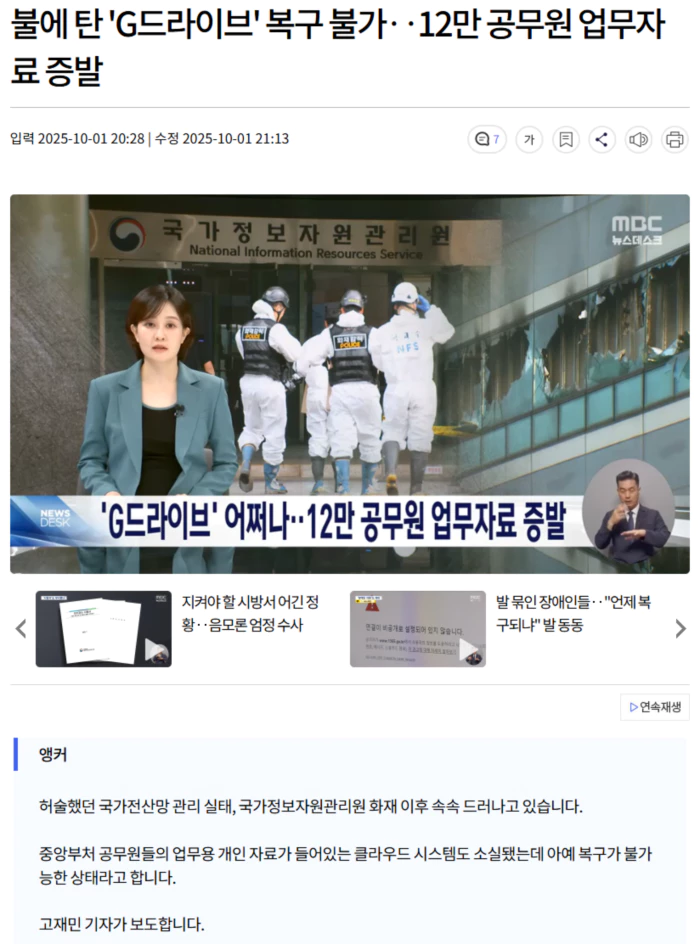"G드라이브는 지금 백업이 없어서 복구가 불가능한 상황으로 판단되고 있습니다. 지금 현재로서는 완전히 소실되어 복구가 불가능한 것으로."