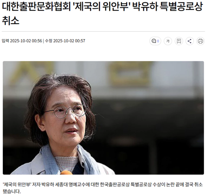 대한출판문화협회는 어제(1일) 오후 긴급 상무이사회의와 책의 날 한국출판유공자상 및 관련업계 유공자상 운영위원회를 소집해 박유하 교수와 '제국의 위안부' 출판사 정종주 대표에게 주기로 한 특별공로상을 취소하기로 결정했다고 밝혔습니다.