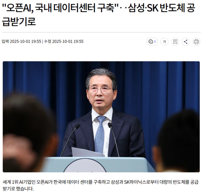 대통령실 하정우 AI수석은 "오픈AI가 두 회사와 협력의향서를 체결했으며, 별도로 한국에 지역 데이터 센터를 구축하며 한국의 AI전환을 함께하려는 것"이라고 설명했습니다.