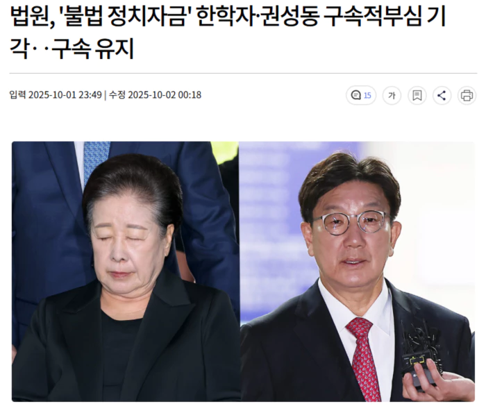 서울중앙지법은 윤석열 정부와 통일교 간 '정교유착' 의혹 등으로 구속된 한학자 통일교 총재의 구속적부심 청구를 기각했습니다.