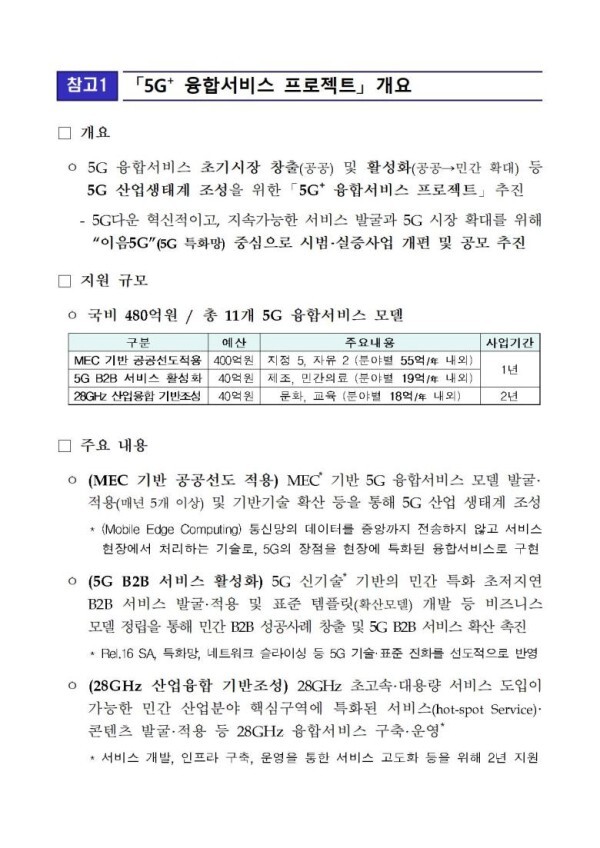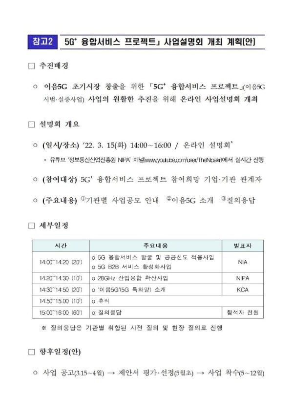 □ ⌜5세대(5G)+ 융합서비스 프로젝트⌟ 사업은 3월 15일(화) 사업 설명회 개최 후 본 공고를 진행할 예정이다.