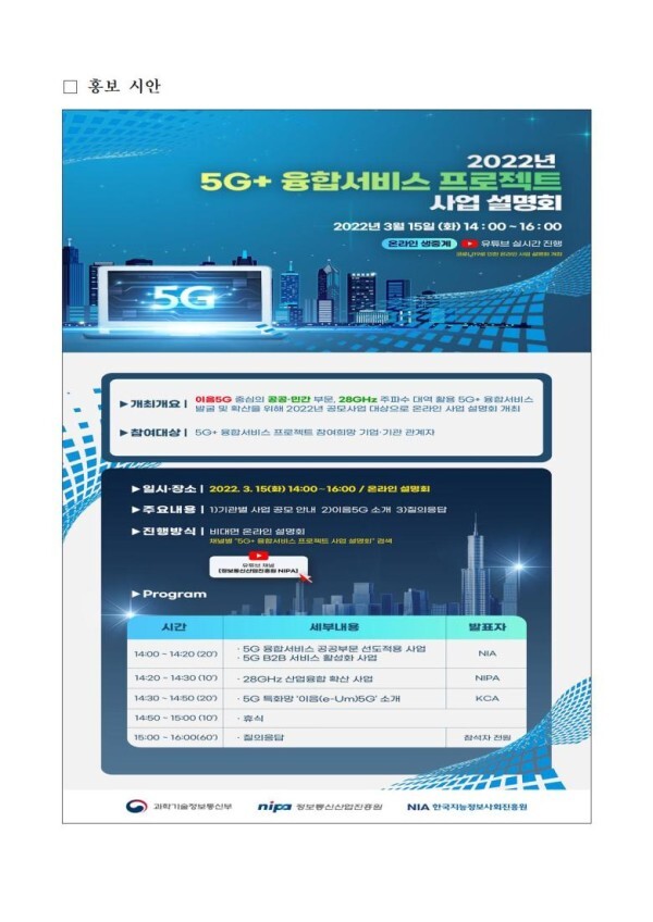 □ 과학기술정보통신부(장관 임혜숙, 이하 ‘과기정통부’)는 한국지능정보사회진흥원(원장 문용식, 이하 ‘NIA’), 정보통신산업진흥원(원장 허성욱, 이하 ‘NIPA’)과 함께 ⌜5세대 이동통신(이하 ‘5G’)+ 융합서비스 프로젝트⌟ 사업 설명회를 3월 15일(화)에 개최하고 본격 추진한다.