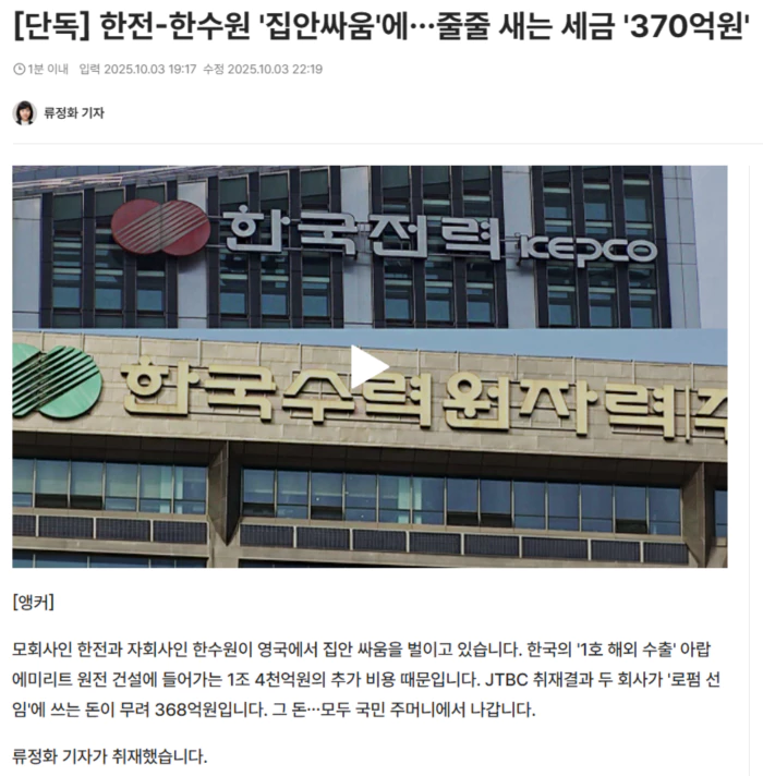 [기자] 아랍에미리트 바라카 원전, 2009년 한국이 22조원에 처음 수주한 해외 원전입니다. 우리 기술력을 인정받았다는 상징성에 역대 대통령들도 차례로 방문했습니다. 하지만 지금은 계약을 따낸 한전, 시공과 시운전을 맡은 한수원 사이 분쟁 거리가 됐습니다. 완공이 목표했던 2020년에서 2024년으로 지연됐고, 수차례 설계를 변경한 끝에 1조 4000억원의 추가 비용이 발생한 게 문제입니다. [이상민/한국수력원자력 부사장 (지난 2월) : 한수원에서는 계속적으로 저희들 비용 발생한 것에 대해서 정산을 청구해 왔고…] [김동철/한국전력 사장 : UAE 발주처에 요청해서 받아낼 수 있으면 협상으로 받아 내든지… 자회사가 모회사를 상대로 제기했기 때문에 저희 한전은 매우 유감인 것이고.] 이견은 좁혀지지 않았고 한수원은 올해 5월 한전을 상대로 런던국제중재법원에 중재를 신청했습니다. 원전 수주 계약 당시, 당사자끼리 해결 못한 분쟁은 이 곳에서 중재하기로 했기 때문입니다. 한수원은 228억원, 한전은 140억원에 각각 대형로펌을 선임한 것으로 JTBC 취재결과 확인됐습니다. 양 사 모두 영국 현지 로펌과 컨소시엄을 구성하면서 소송 비용이 더 늘어난 겁니다. .. 후략 ..
