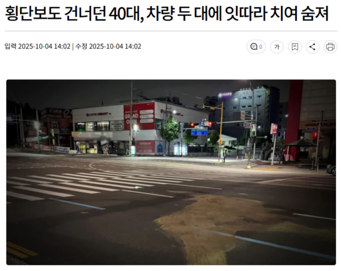 오늘(10/4) 새벽 1시 45분쯤 인천 계양구 작전동의 한 사거리에서 횡단보도를 건너던 40대 남성이 차량 2대에 잇따라 치여 숨졌습니다.