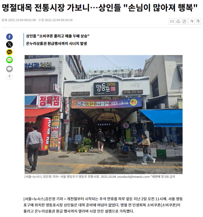 4일 정부에 따르면 2차 소비쿠폰 신청률은 지난 28일 기준 74.7%를 기록했다. 지난달 22일 신청이 시작된 지 일주일만이다. 기획재정부는 1차 소비쿠폰 접수가 개시된 올해 7월 21일부터 6주간 신규 창출된 매출 규모를 약 2조1073억원으로 추정했다. 7년째 반찬가게를 운영하고 있다는 김모씨(71)의 좌판에는 포장된 명절 음식이 가득했다. 김씨는 "처음 들어왔을 때 재개발 공사하고 얼마 있다 코로나가 터져서 정말 힘들었다. 슬슬 회복되나 싶었는데 계엄 터지고 매출이 3분의 1이 줄더라"고 털어놨다. 김씨에게 소비쿠폰은 동아줄이었다. 김씨는 "1차 풀리고 50%나 올랐다. 소비쿠폰 쓰러 전통시장에 와줘서 너무 고맙다"며 "지난 설 명절보다 지금이 훨씬 낫다"고 미소 지었다. 건강식품 장사를 한 지 20년이 넘었다는 윤모씨(64)는 "지난해 추석보다 올해 추석이 매출이 더 올랐다"며 "소비쿠폰으로 토종꿀이나 선물세트를 사가는 손님들이 늘었다. 소비쿠폰이 전통시장 살리는데 정말 좋은 정책이라 자주 했으면 좋겠다"고 말했다. 그는 "소비쿠폰이랑 온누리상품권 행사도 같이 하니까 시너지가 엄청나다"며 "사람들이 소비쿠폰도 쓰면서 온누리상품권 환급 금액을 맞추려고 돈을 더 쓰더라"고 첨언했다. 이날 시장 안에 마련된 온누리상품권 환급소에는 이른 시간임에도 열댓명이 환급을 기다리고 있었다. 농림축산식품부와 해양수산부는 지난 1일부터 5일간 전통시장에서 국산 농축산물 구입할 경우, 구매 금액의 최대 30%(1인당 최대 2만원)를 온누리상품권으로 돌려주는 행사를 진행 중이다. 남편과 25년째 정육점을 운영하는 김모씨(66)는 제사용 머릿고기 손질에 한창이었다. 김씨는 "1차 소비쿠폰이 풀리고 매출이 배로 뛰었다. 바람직한 정책이고 이번 장사가 정말 기대된다"고 대답했다. 김씨는 "온누리상품권 환급까지 겹치면서 손님들이 엄청 올 것 같다"며 "지난달 열린 환급행사도 소비쿠폰이랑 해서 호응이 참 좋았다. 할머니들이 손자한테 온누리상품권 쓰는 법 배워서 오더라. 손님이 너무 많아 줄서서 계산했을 정도"라고 했다. .. 후략 ..