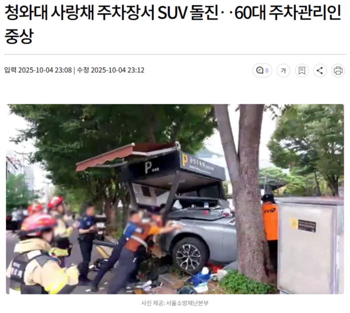 오늘(10/4) 오후 2시 20분쯤 서울 종로구 창성동에 있는 청와대 사랑채 공영주차장에서 70대 여성이 몰던 SUV 차량이 주차 관리실로 돌진했습니다.