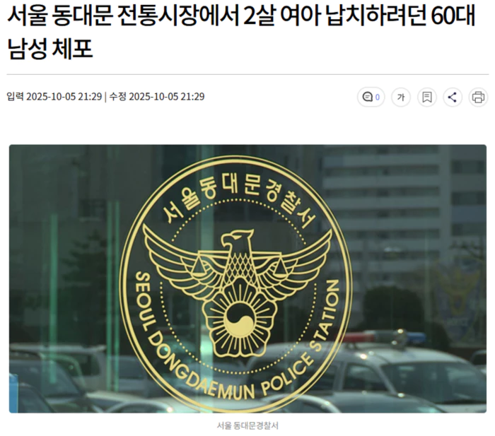서울 동대문경찰서는 어젯밤 10시쯤 동대문구의 한 전통시장 골목에서 2살 아이를 강제로 안아 데려가려 하는 등 미성년자 약취유인 미수 혐의로 60대 남성을 현행범 체포했습니다.