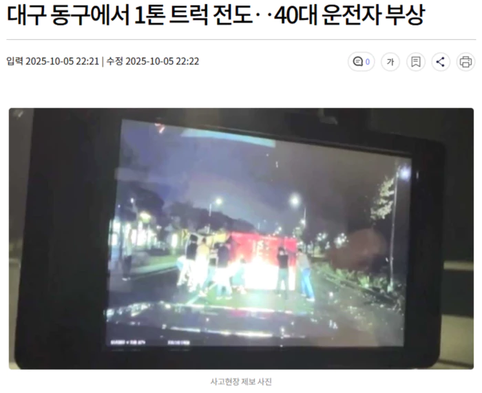 오늘(10/5) 저녁 7시쯤 대구 동구 각산동의 한 도로를 달리던 1톤 화물차가 나무와 가로등을 들이받고 옆으로 넘어지는 사고가 났습니다.