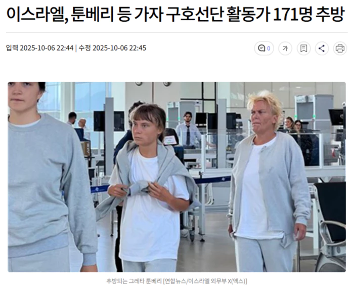 이스라엘 정부가 스웨덴 환경운동가 그레타 툰베리 등 팔레스타인 가자지구 구호선단 활동가 171명을 추방했습니다.