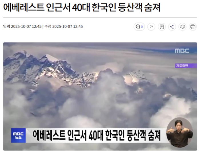 로이터통신은 현지시간 6일 에베레스트산에서 남쪽으로 약 31㎞ 떨어진 네팔 동부 메라피크봉에서 46살 한국인 등산객의 시신이 수습됐다고 보도했습니다.