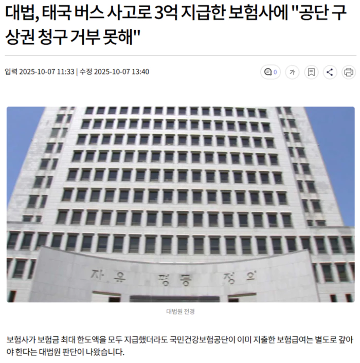 이에 건보공단은 귀국해 치료를 받는 피해자들에게 3천9백만 원가량의 보험급여를 지급했고, 이후 여행사와 여행 보험을 체결한 A 보험사는 피해자들에게 책임보험 보상 한도인 3억 원을 지급했습니다.