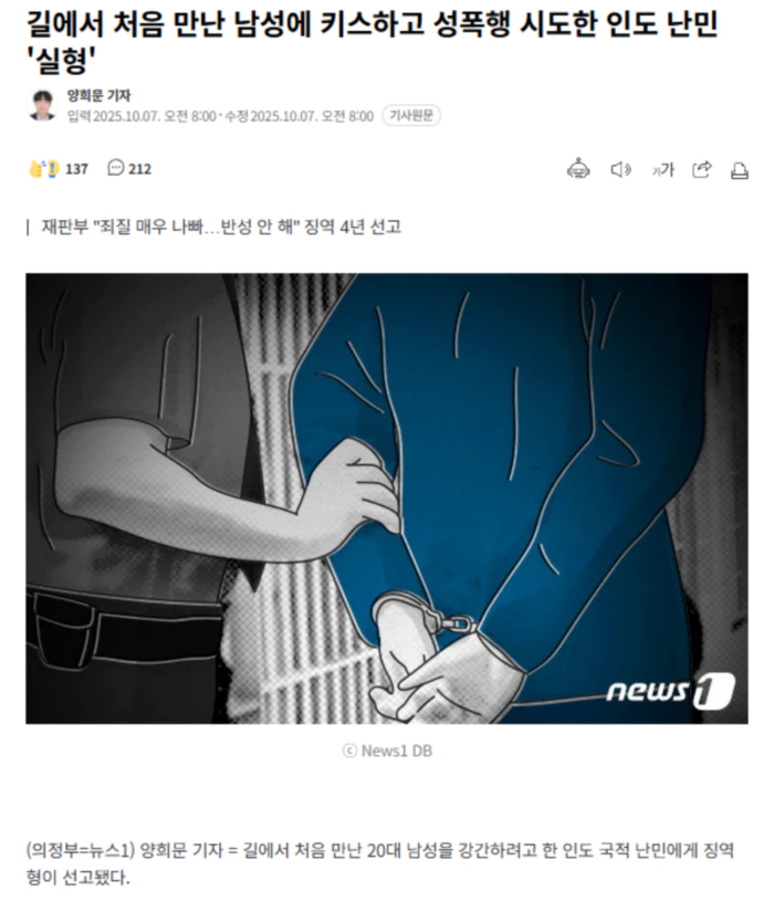 7일 법조계에 따르면 의정부지법 제13형사부(부장판사 오윤경)는 유사강간 혐의로 기소된 인도 국적 남성 A 씨에게 징역 4년을 선고했다. 재판부는 또 5년간의 아동·청소년·장애인 관련 기관 취업제한을 명령했다. A 씨는 지난해 9월 16일 오전 0시께 경기 포천시 한 노상에서 20대 남성 B 씨를 유사강간하려고 한 혐의로 재판에 넘겨졌다. 그는 길을 걷던 B 씨에게 "어디로 가는 길이냐"라고 물어보며 함께 맥주를 마시자고 제안하며 대화를 나눴다. 이후 B 씨는 귀가하기 위해 먼저 자리를 떴는데, A 씨는 B 씨를 뒤따라간 뒤 그에게 입맞춤을 했다. 깜짝 놀란 B 씨는 그대로 넘어졌고 A 씨는 반항하지 못하게 그의 몸 위로 올라타 성폭행하려했다. A 씨는 2022년 단기비자를 통해 한국에 입국한 뒤 난민신청을 해 올해 4월 18일까지 체류자격을 얻은 상태였다. 법정에 선 A 씨는 "합의하에 키스를 한 사실은 있으나 유사강간 행위는 없었다"는 취지로 주장했다. 하지만 재판부는 A 씨의 주장을 받아들이지 않았다. 그 근거로 피해자의 일관된 진술과 허위로 피고인에게 불리한 진술을 할 만한 동기나 이유가 없는 점을 들었다. .. 후략 ..