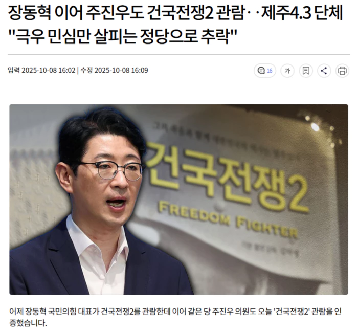 이같은 국민의힘 일부 의원들의 건국전쟁2 관람을 두고 제주 지역에서는 비판이 쏟아지고 있습니다.