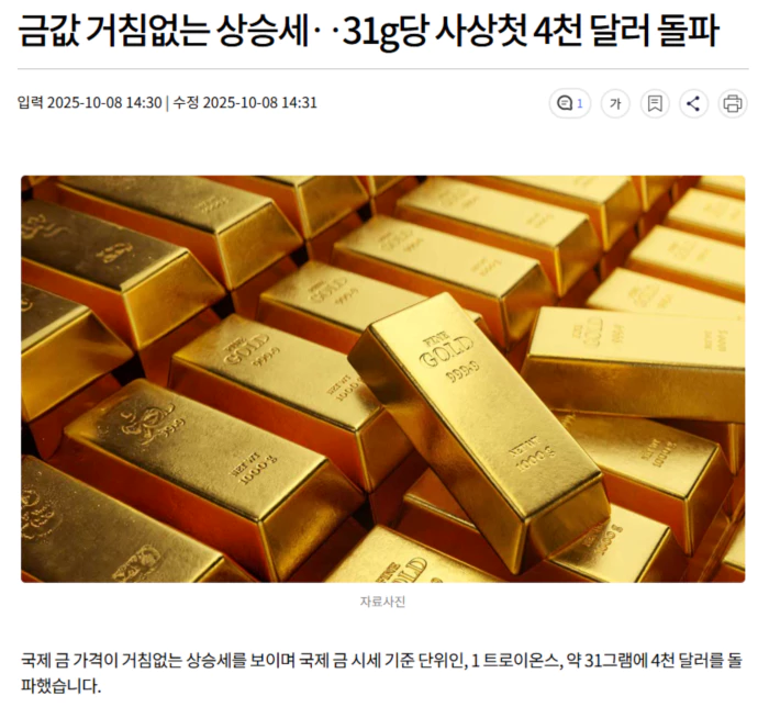 또 미 연방정부의 셧다운, 즉 일시 업무 정지와 프랑스 정치 위기에 따른 투자자들의 안전 자산 선호 심리, 미국의 추가 금리 인하 가능성 등이 투자자들을 안정적인 금 거래로 이끌었다고 외신들은 전했습니다.