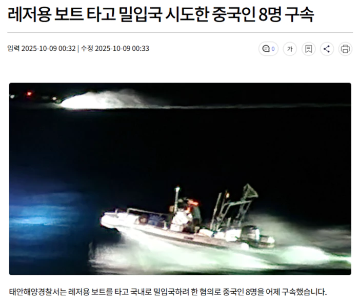 이들은 지난 5일 오전 10시쯤 중국 산둥성 웨이하이에서 길이 7m, 폭 3m의 레저용 보트를 타고 출항해 우리나라로 밀입국하려 한 혐의를 받고 있습니다.