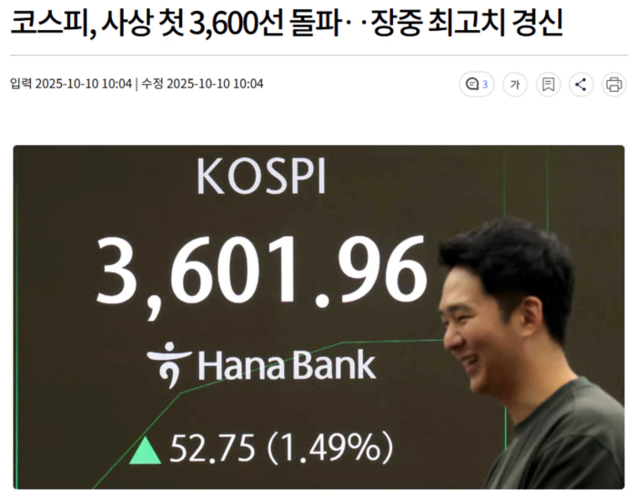 추석 황금연휴를 마치고 개장한 코스피가 사상 처음으로 3,600선을 돌파했습니다.