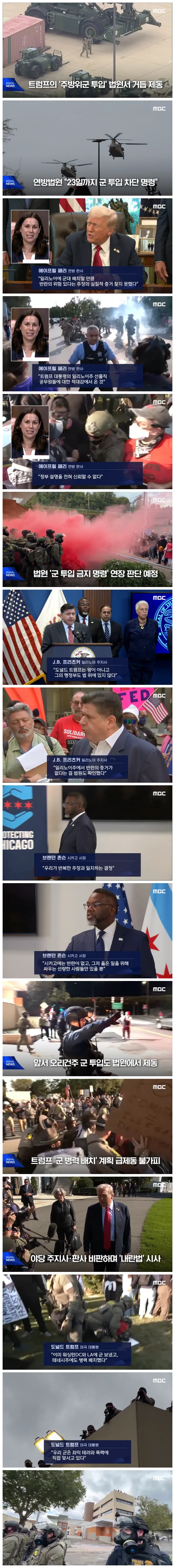 CNN 등 외신들은 시카고가 있는 일리노이주 연방 지방법원의 에이프릴 페리 판사가 현지 시각으로 9일 오는 23일까지 군 병력 투입을 일시 차단하는 명령을 내렸다고 보도했습니다.
