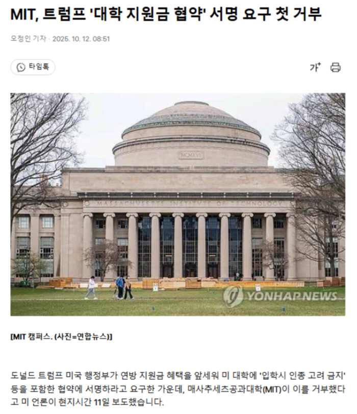 폭스뉴스와 뉴욕타임스(NYT) 등에 따르면 샐리 콘블루스 MIT 총장은 행정부에 지난 10일 보낸 서한에서 "과학 연구에 대한 재정 지원은 오로지 과학적 성과에 기반해야 한다"며 협약 서명을 거부했습니다. 앞서 트럼프 행정부는 대학 9곳에 서한을 보내 '고등 교육의 학문적 우수성을 위한 협약' 서명을 요청했습니다. 이 협약에는 입학·채용 과정에서 인종이나 성별 고려 금지, 외국인 학부생 등록률 15%로 제한, 대학입학자격시험(SAT)이나 유사시험 성적 제출 의무화, 등록금 5년간 동결 등의 조항이 포함돼 있습니다. 트럼프 행정부는 대학이 협약에 서명할 경우 상당한 규모의 연방 지원금을 포함해 여러 혜택을 받을 것이라고 서한에서 밝혔습니다. 서한을 받은 대학은 다트머스대, 펜실베이니아대, MIT, 브라운대, 밴더빌트대, 애리조나대, 서던캘리포니아대, 텍사스대, 버지니아대 등 9곳입니다. MIT는 이 협약 서명을 공개 거부한 첫 대학입니다. 리즈 휴스턴 백악관 부대변인은 이와 관련, 성명에서 "일생일대의 고등교육 혁신 기회를 거부하는 대학은 학생이나 학부모를 위해 봉사하는 것이 아니라, 급진 좌파 관료들에게 굴복하는 것"이라고 비판했습니다. 백악관은 대학들로부터 오는 20일까지 답변을 받기를 기대한다고 밝혔습니다. 그러나 대학들 사이에서는 이를 두고 학문 영역에 대한 정부의 정치적 개입이자 고등교육의 독립성을 위협하는 조치라는 불만이 제기되고 있습니다. .. 후략 ..
