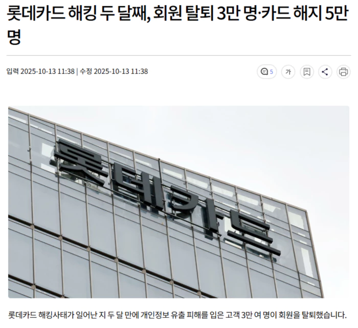 롯데카드 측은 오늘 고객 보호조치 현황을 발표하면서, 지난달 1일부터 어제까지 해킹사고로 정보가 유출된 회원 전체 297만 명 가운데 3만 7백여 명이 탈퇴했고, 5만 6천 5백여 명이 카드를 해지했다고 밝혔습니다.