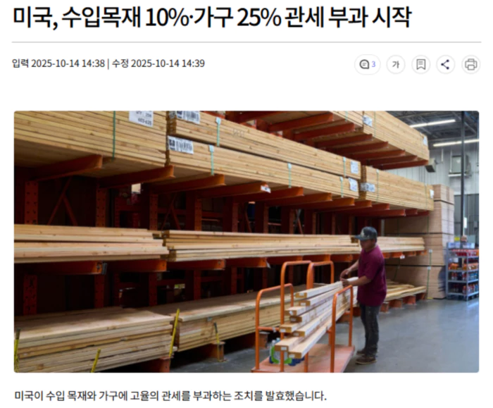 트럼프 행정부는 현지시간 14일 0시부터 수입 가공 목재에는 10%, 소파와 화장대 등 천을 씌운 가구와 주방 찬장 등의 가구에는 25%의 관세를 각각 부과합니다.