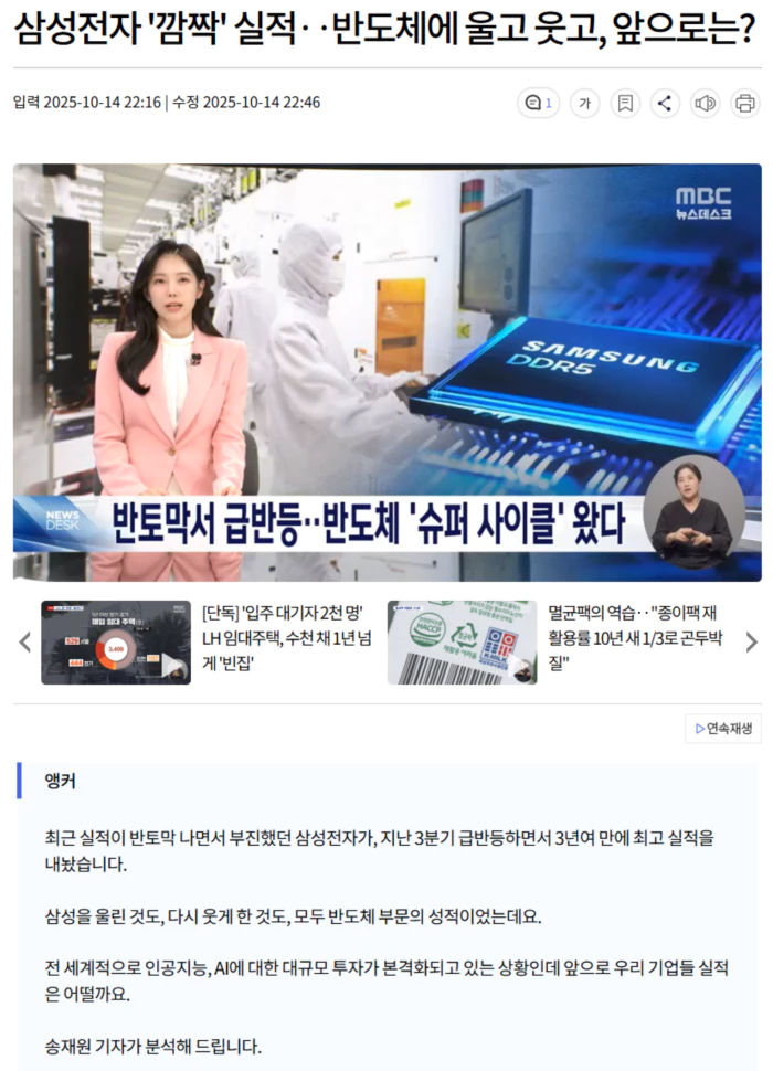 | 삼성전자 3분기 영업이익 12조 원대.. 반도체 사업 개선 (0) | 2025.10.14 |